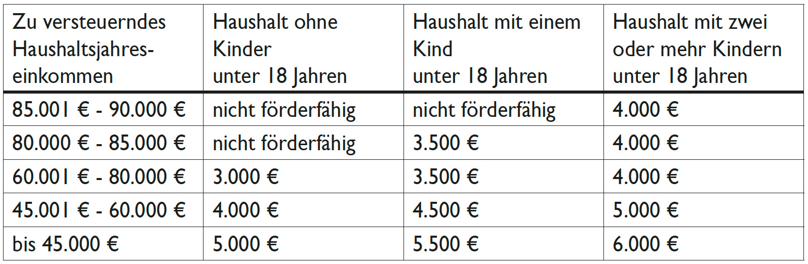 Die Einkommensgrenze liegt bei 80.000 € zu versteuerndem Haushaltsjahreseinkommen. Diese erhöht sich um 5.000 € für jedes Kind auf bis zu 90.000 € zu versteuerndem Haushaltsjahreseinkommen. Als Nachweis dienen die Steuerbescheide der Vorjahre.